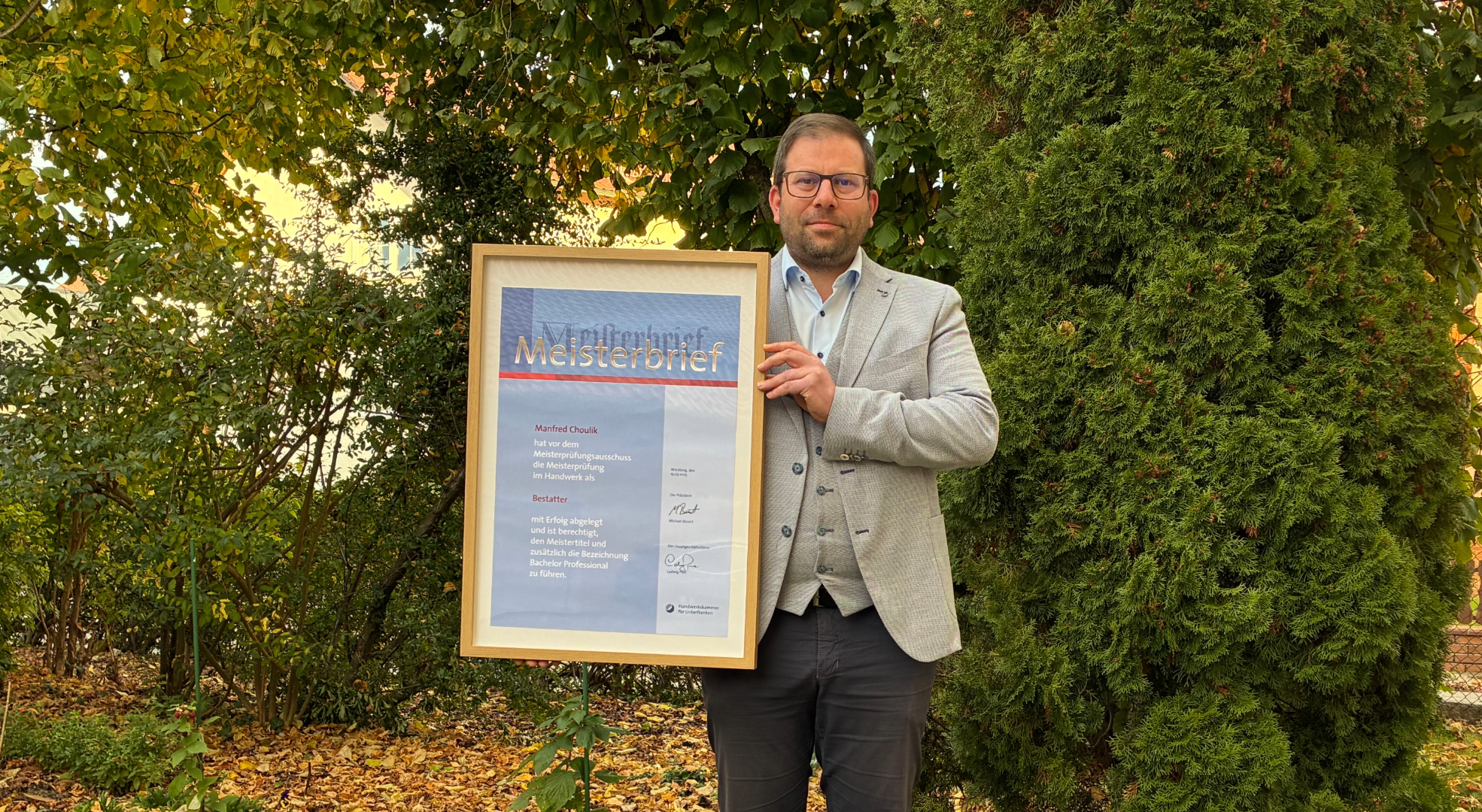 Der Betriebsleiter von Bestattungen Lang in Nittenau, Manfred Choulik, hat im Mai 2025 erfolgreich die Meisterprüfung im Bestattungsgewerbe abgelegt und im Sommer den Meisterbrief der Handwerkskammer für Unterfranken erhalten.